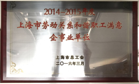 公司榮獲上海市總工會(huì)頒發(fā)“2014-2015年度勞動(dòng)關(guān)系和諧職工滿意企事業(yè)單位”榮譽(yù)稱號(hào)。